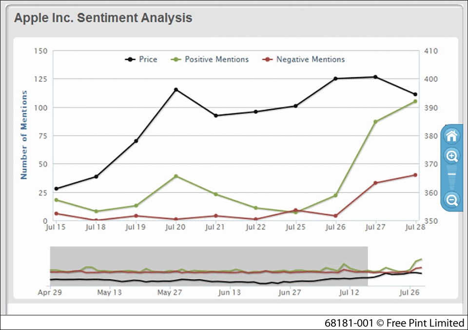 The positive and negative sentiment mentions for a specific company are plotted onto graphs in comparison to its stock price. Or, the daily sentiment of the larger market, such as the S&P 500, can be plotted. Other potential analysis include comparing which stocks have the most positive and negative sentiment, as well as trending stocks to decipher which companies are receiving news or chatter during a particular time period.