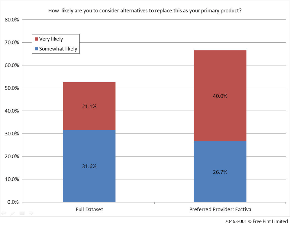 Two-thirds of those for whom Factiva is the preferred product are likely to consider alternatives, and 40% of them are "very likely" and actively seeking those alternatives.
