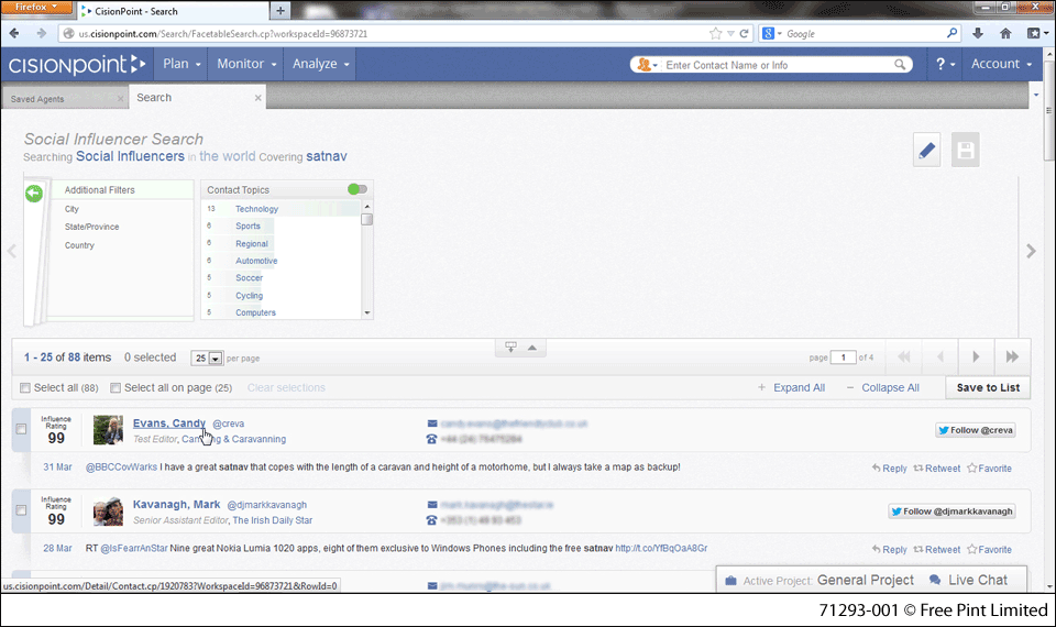 The results are linked to the contact profiles in the database. The profiles are scored with a proprietary Cision Influence Rating based on datapoints such as numbers of followers or retweets, but also online mainstream media indicators such as number of articles on a topic.