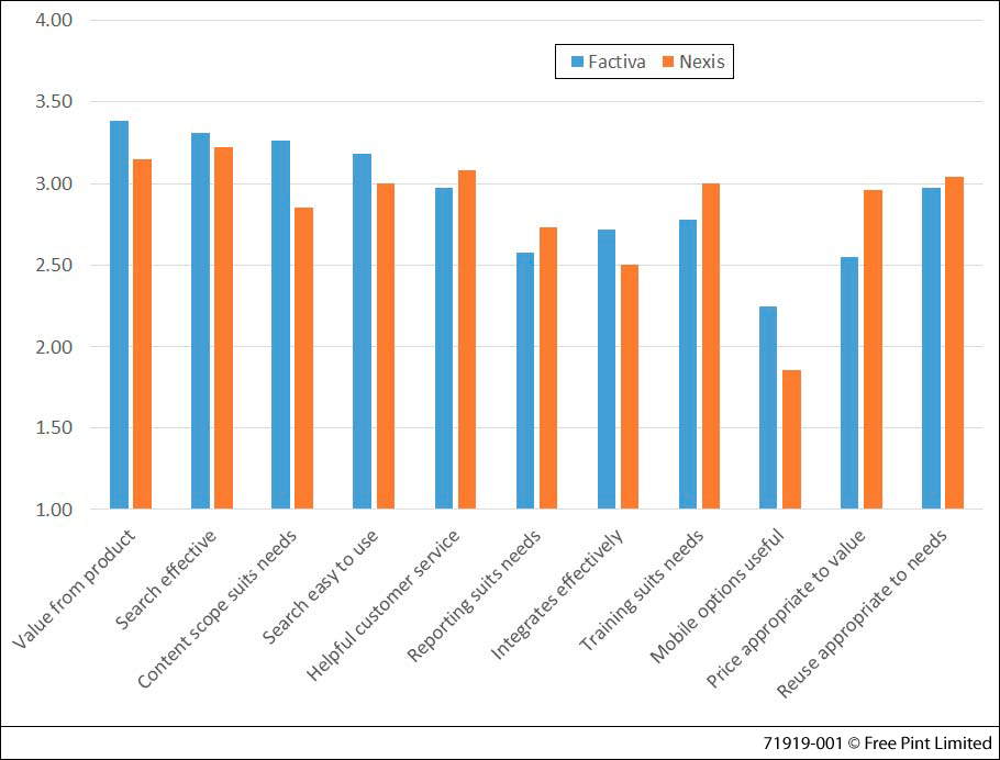 Figure 1: Shows the average ratings for these statements, based on the subsets of respondents who name Factiva as their preferred product and those who name Nexis.