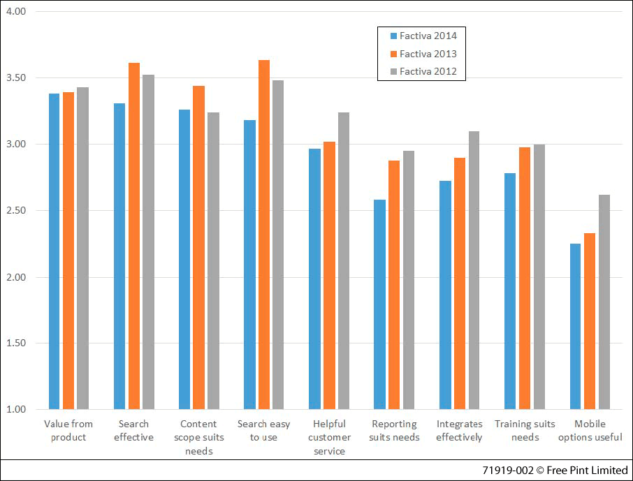 The impact of a year of uncertainty around the future of Factiva can be seen in the data: average satisfaction ratings have declined significantly for nearly every statement.