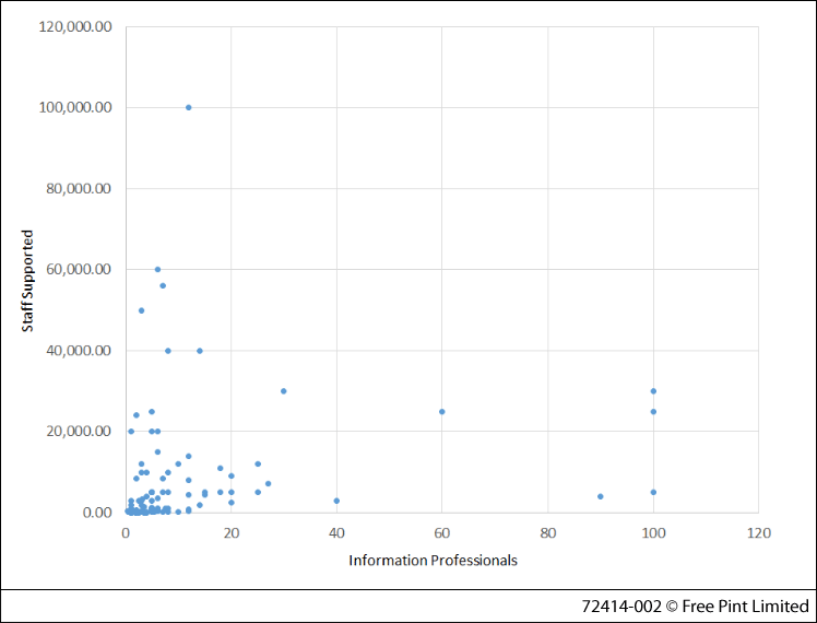 We asked respondents how many staff members they have in their information department, library or equivalent. We also asked how many members of staff those information professionals support. 112 respondents provided valid data for both questions, enabling us to create a scattergram of relative sizes of information staff to supported staff. This is shown in Figure 2.