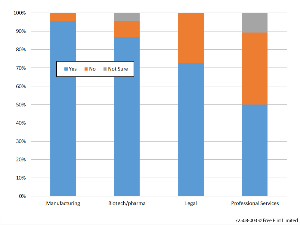 However, there are clear differences in penetration and use by market segment. With roughly the same number of respondents in each group, an average of 91% of respondents in manufacturing and biotech/pharmaceutical industries have deployed ebooks. However, that percentage drops to 73% for legal services and to 60% for professional services.