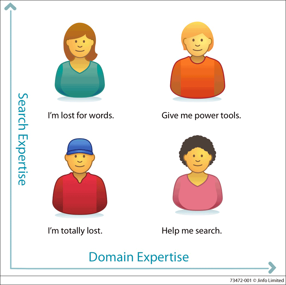 This highlights the range of skills and needs of different users, including the special role of the power searcher, who combines both search system expertise and domain expertise.