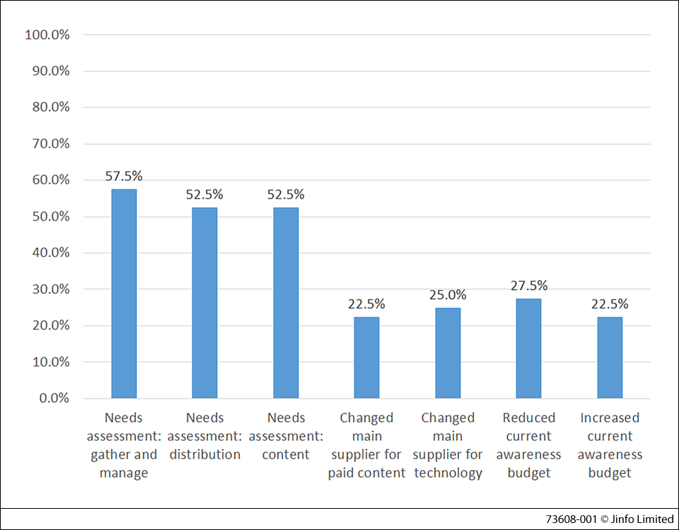 - Around half of respondents have completed needs assessments on content, distribution or management of sources for current awareness within the past two years