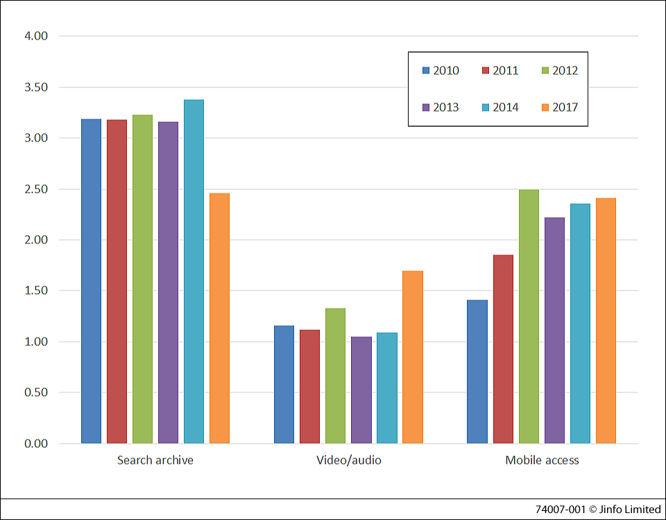 We also ask respondents how frequently they perform certain activities with their news and current awareness content - the same question we have asked in the same way since 2010.